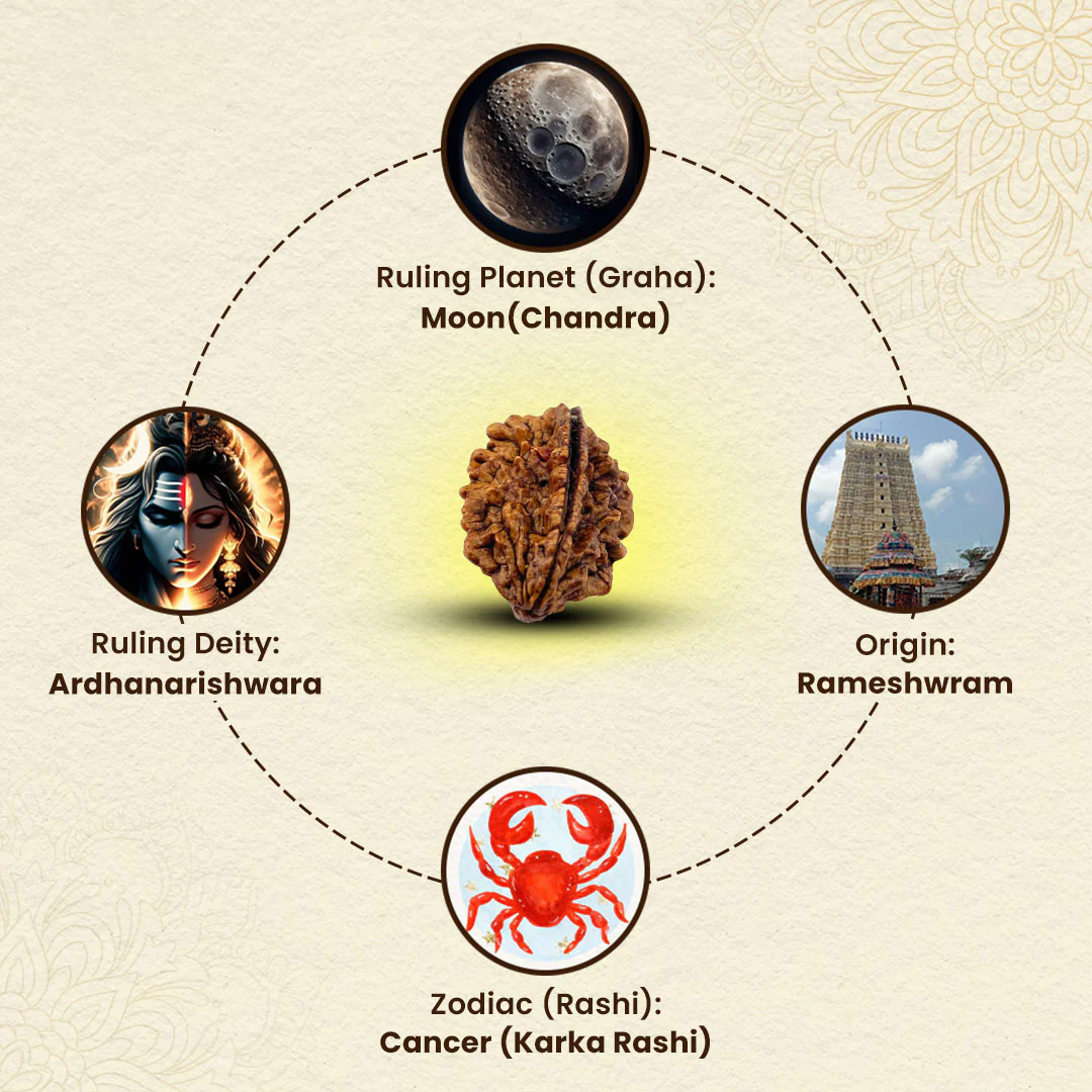 Natural 2 Mukhi Rudraksha associated with Om Shiva, Cancer moon sign, and traditional Chandra grah symbolism.