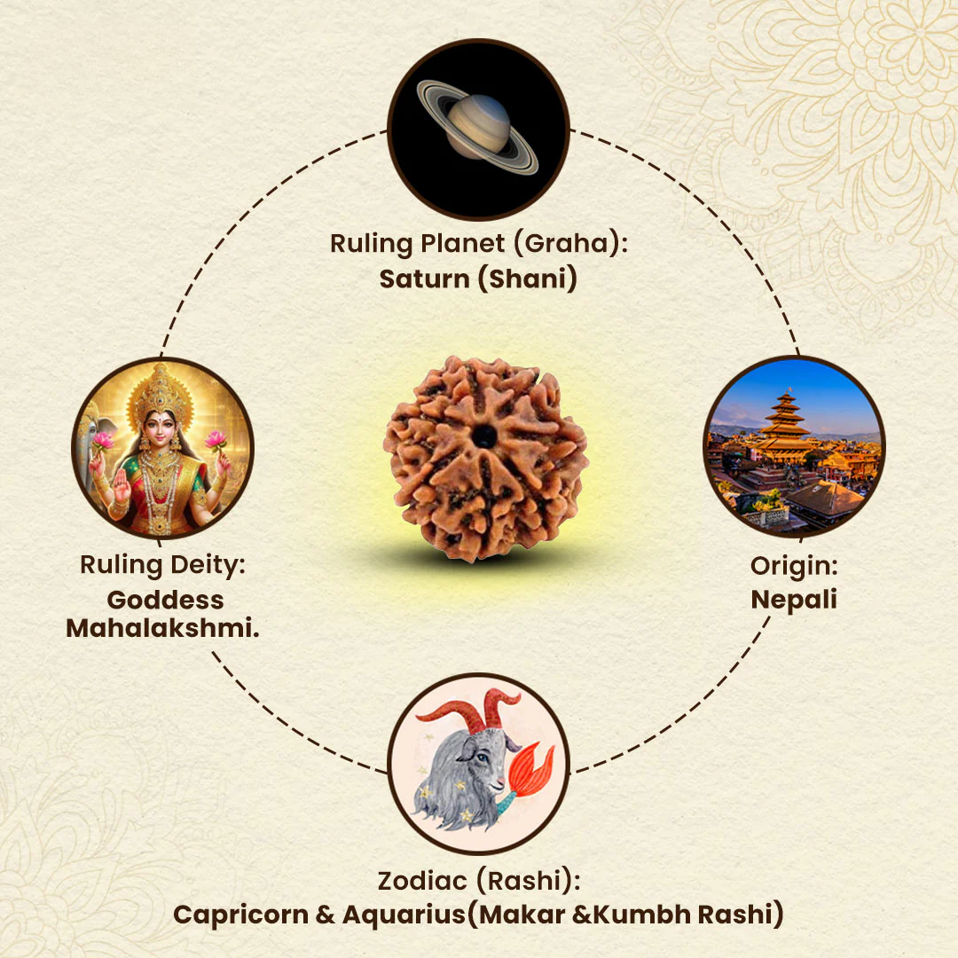 7-Mukhi Rudraksha, ruled by Shani, associated with Goddess Lakshmi, and beneficial for Makar & Kumbh Rashi
