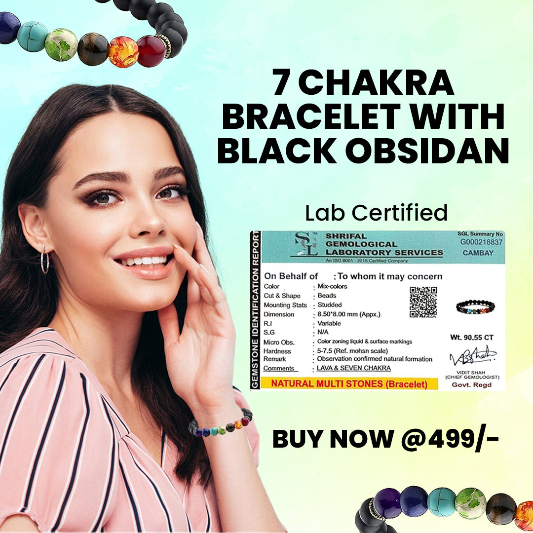 Certified 7 Chakra Crystal Bracelet with Black Obsidian Beads – Reiki Healing | Perfect for Men & Women