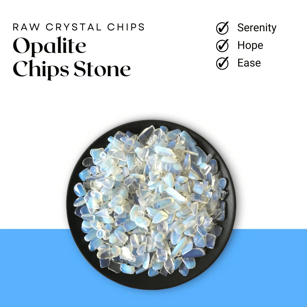 These small, tumbled Opalite chips are a luminous way to incorporate gentle, uplifting energy into your environment. Known for its mesmerizing blue-to-peach opalescence, this stone effectively promotes inner peace, aids in smooth transitions, and encourages a lighthearted outlook. Opalite chips are ideal for placing in areas needing a calming, serene atmosphere, especially bedrooms or meditation spaces, to stabilize mood and enhance communication.