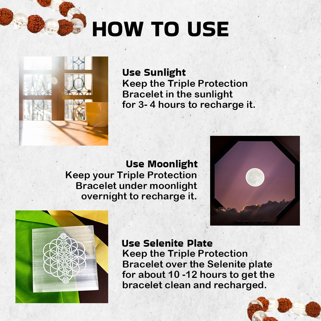 It's recommended to cleanse and charge your crystal bracelet regularly, especially after heavy use or exposure to negative energy. Methods include placing it on selenite. You need to re- cleanse and recharge them once in a week by placing on selenite plate in moonlight and leave it overnight untouched.