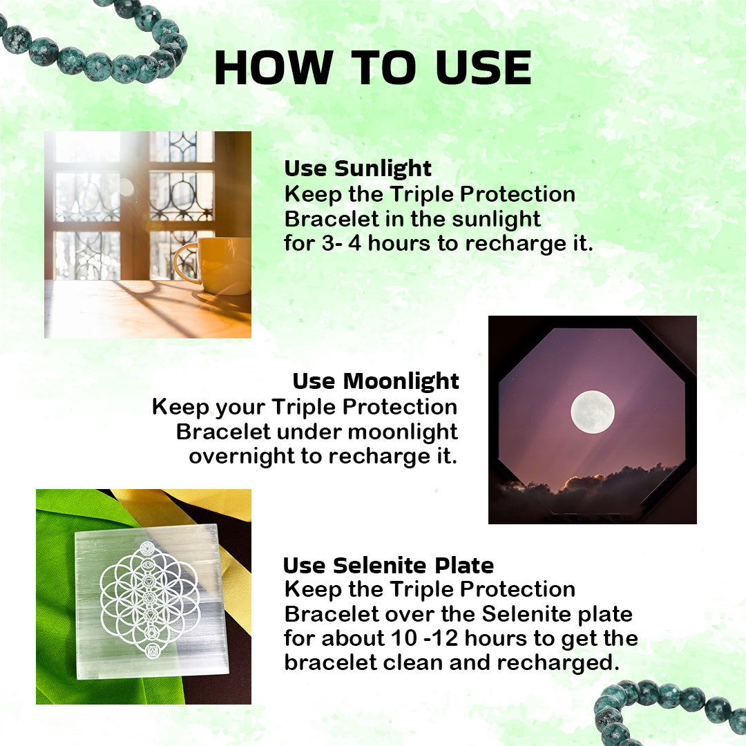 It's recommended to cleanse and charge your crystal bracelet regularly, especially after heavy use or exposure to negative energy. Methods include placing it on selenite. You need to re- cleanse and recharge them once in a week by placing on selenite plate in moonlight and leave it overnight untouched.